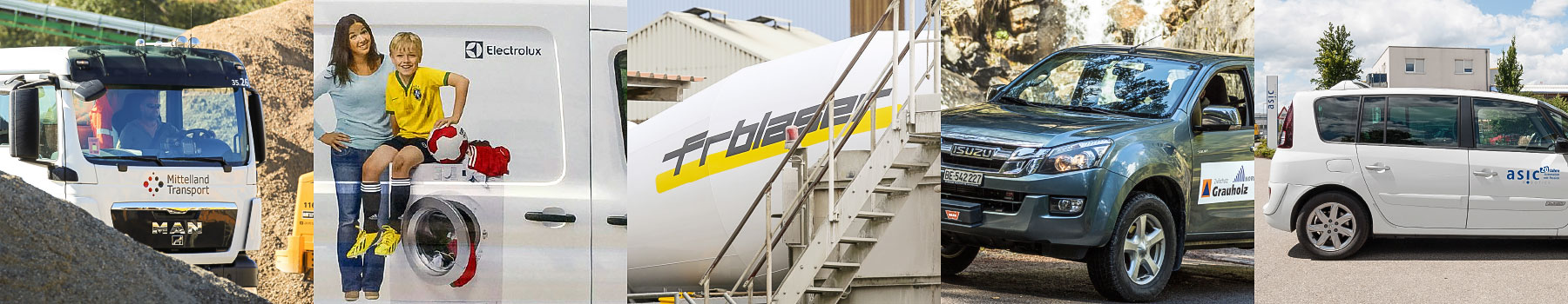 Fahrzeugbeschriftungen werden meist nur kurz wahrgenommen, nur angeschaut, kaum ganz gelesen und schon gar nicht auswendig gelernt. Entscheidend ist, dass der Betrachter in kürzester Zeit erfassen kann, was von wem angeboten wird. Wichtig sind kurze und einprägsame Informationen sowie eine klare Bildsprache. Hier gilt besonders: Viel weniger ist mehr.