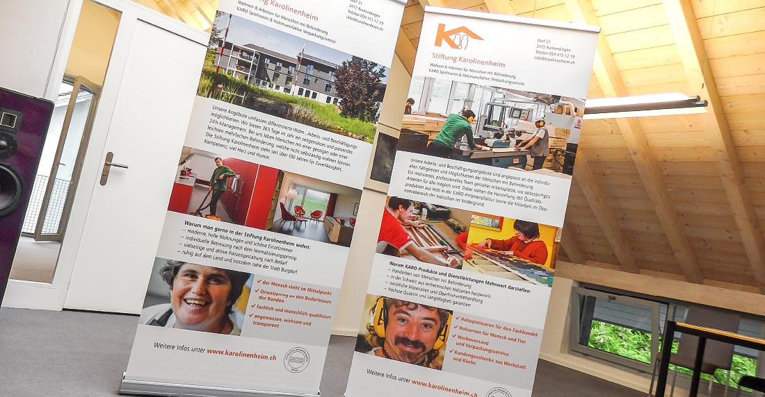 Nebst den abgebildeten Rollups erstellten wir auch andere Kommunikationsmittel für das Karolinenheim, wie ein Jubiläumslogo zum 100-jährigen Bestehen, die Briefschaften, die Website u.a.m.